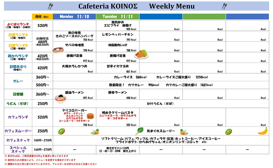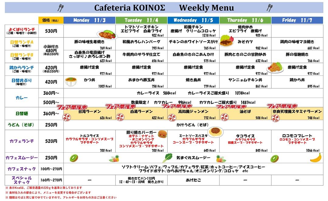 カフェテリア コイノスは、本学創立70周年記念事業としてリニューアルされた食堂です。ランチメニューだけでなく、カフェメニューも提供しています。