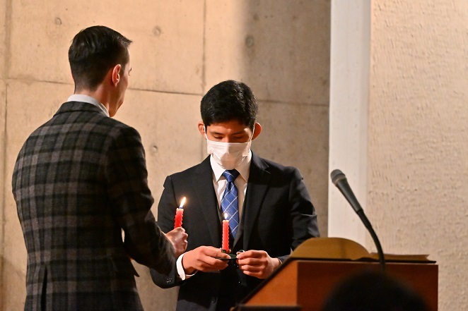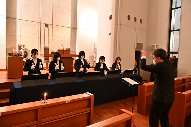 燭火礼拝では、清泉礼拝堂聖歌隊・ハンドベル演奏とともに、参加者全員のキャンドルに火が灯され、礼拝堂内がキャンドルの美しい光に包まれました。