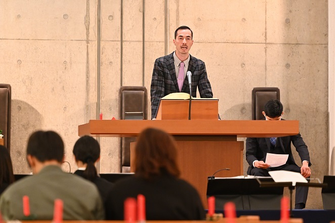 学生による韓国語、スペイン語、日本語での聖書朗読が行われ、ネルソン橋本ジョシュア諒 宗教委員長より、「荒野の声に耳を傾ける」と題してお話をいただきました。