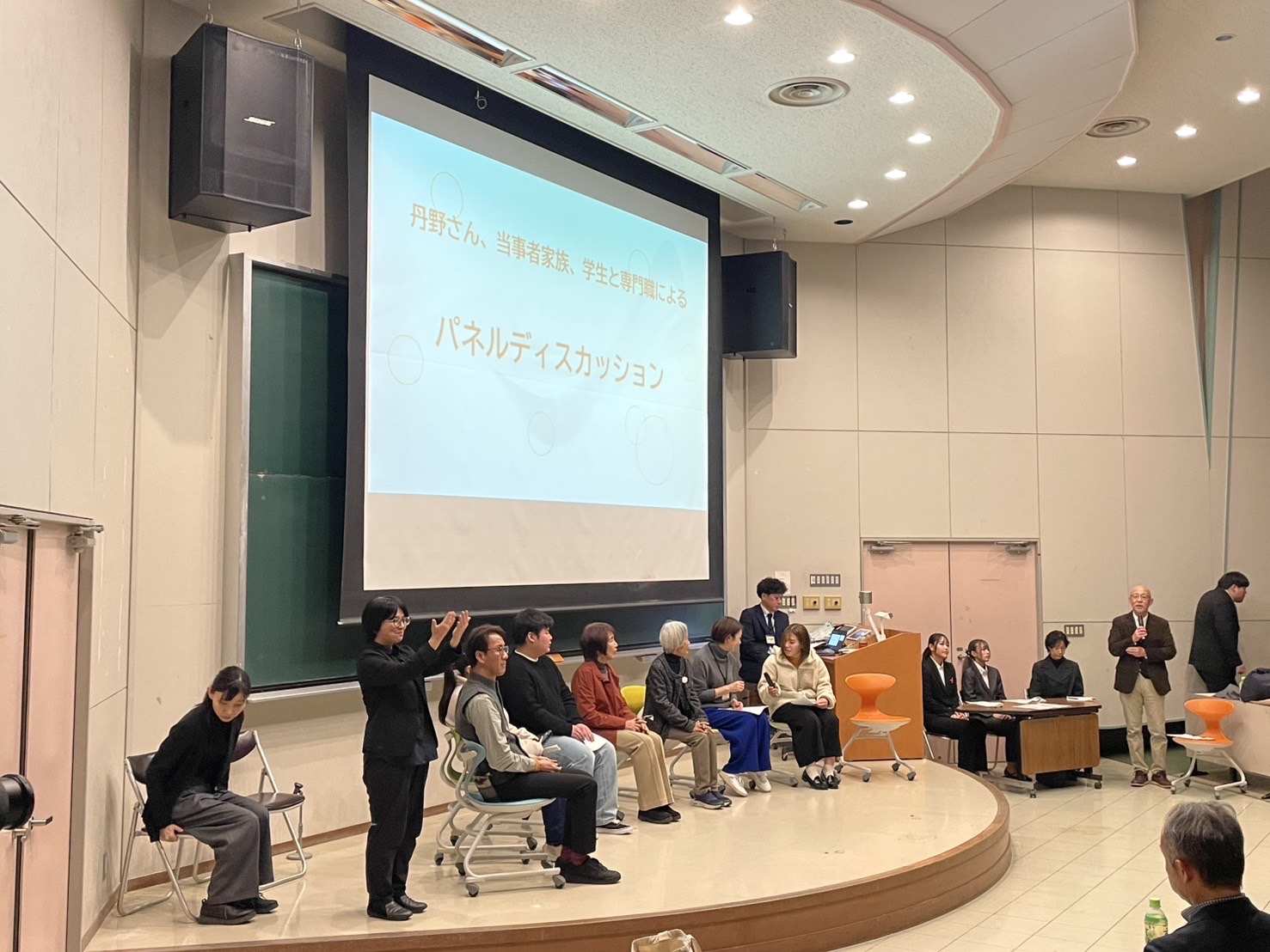 プログラムとしては、若年性認知症当事者の丹野智文氏による講演「笑顔で生きる 認知症とともに」と、そのことを受けてのパネルディスカッションが行われました。パネラーには、本学社会福祉学部の学生、四国学院大学専門学校の学生も登壇し、社会福祉士の実習、介護福祉士の実習での認知症の方との関わりや体験等について発表しました。