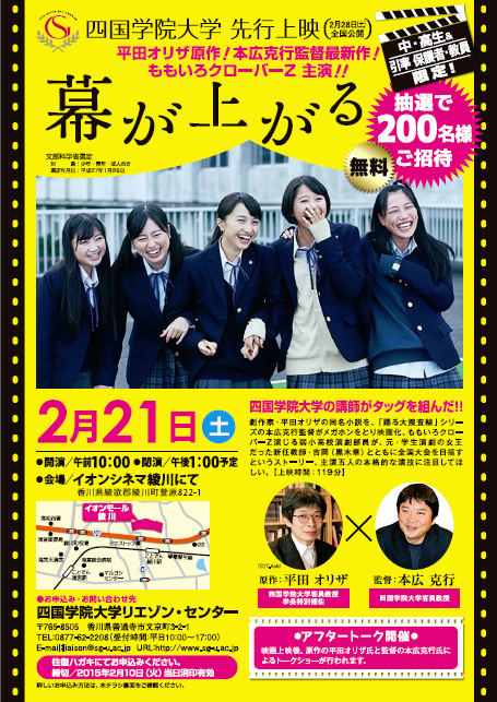 2015年2月21日(土)、イオンシネマ綾川にて、映画『幕が上がる』(2月28日(土)全国公開)の先行上映会を本学主催により開催いたします。対象は中学生・高校生&引率保護者・教員限定です。往復ハガキで申込みされた方より抽選で200名様を無料ご招待いたします。