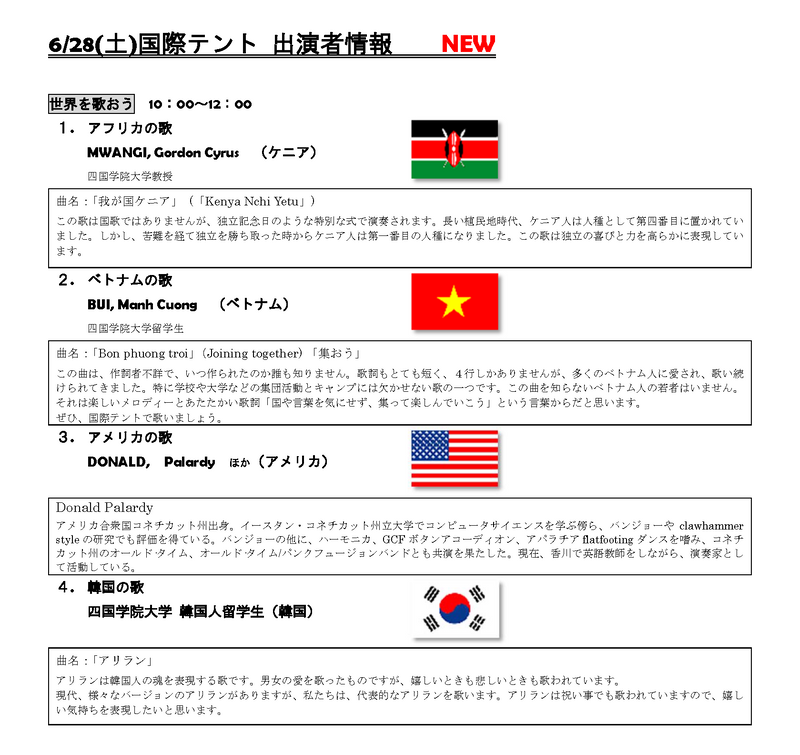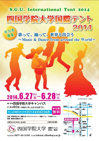 四国学院大学は、1949年にアメリカの宣教師と日本人キリスト者の協力によって始まりましたが、以来、国際性の涵養は教育の重要な柱となってきました。海外の大学との提携を通して学生・教職員の留学や研修を行い、本学キャンパスでも、多彩な国際プログラムが実施されてきました。このような本学の国際教育の伝統は、2010年に開始したメジャー制度全般にも生かされ、特に国際文化マネジメントメジャー、英語メジャー、平和学メジャーなどではその創設理念ともなっています。 2012年より、このような本学の長い国際教育の伝統を生かし、学内の学生教職員だけでなく、国際交流に関心のある学外の方々にもご参加いただき、この地域における新しい国際文化交流イベントの創造を目指して「四国学院大学国際テント(Shikoku Gakuin University International Tent)を開催し、昨年は100名を越えるご参加をいただきました。本年は第3回目の開催となります。 本年のテーマは「歌って、踊って、世界と出会う(Music & Dance from around the World)です。欧米やアフリカ、また日本やアジアの様々な音楽を歌ったり、踊りのパフォーマンスやワークショップを体験しながら、世界の様々な文化の理解を深めてみたいと願っています。毎回国際色豊かな手料理が並ぶ好評の歓迎夕食会は、今回も準備中です。国際文化交流に関心のあるたくさんの方々、特に世界の音楽や踊りが大好きな皆様のご参加を心よりお待ちしています。