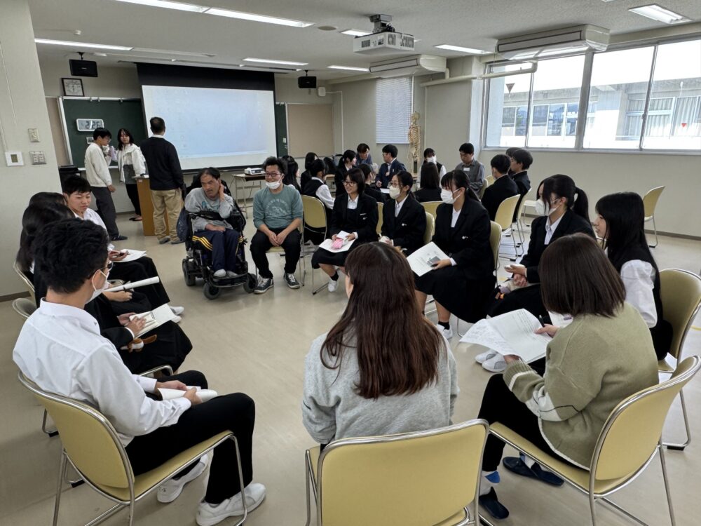 この訪問は、社会福祉学部・富島教授が企画する「障害者理解のための当事者・生徒・学生の交流会」の一環として実施されたもので、前回の香川県藤井高等学校に続き2回目の開催となります。