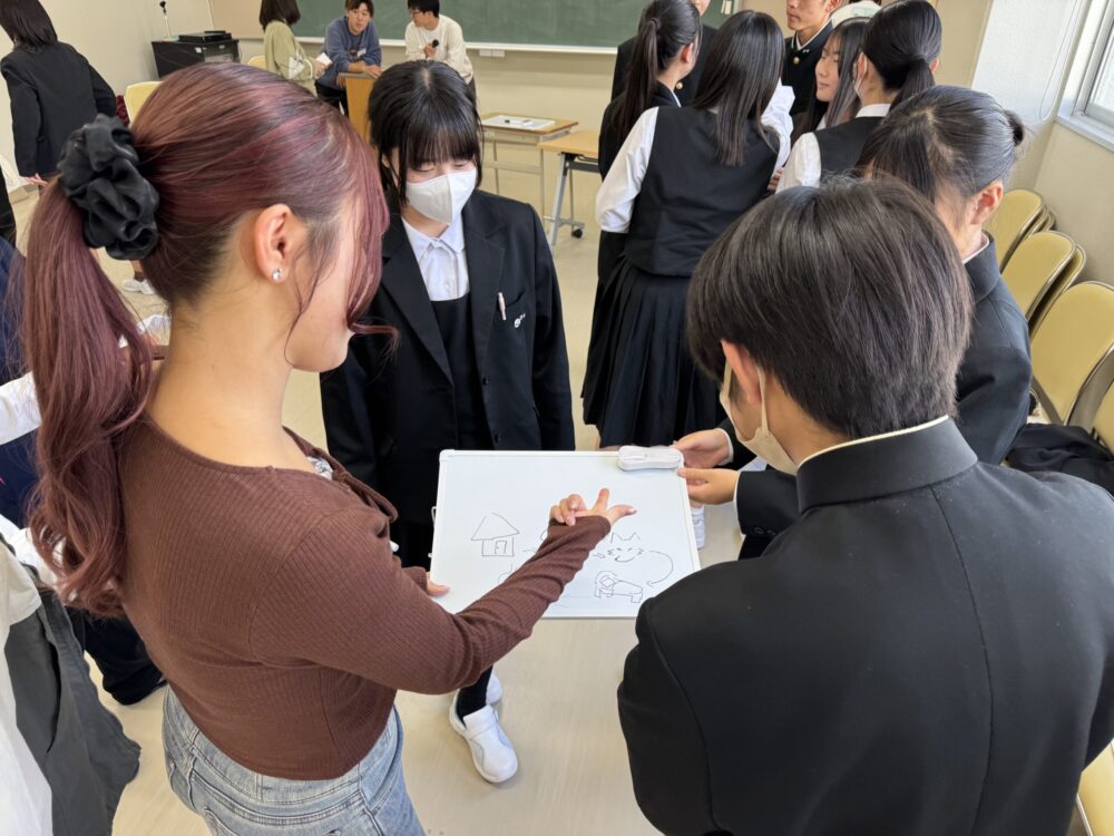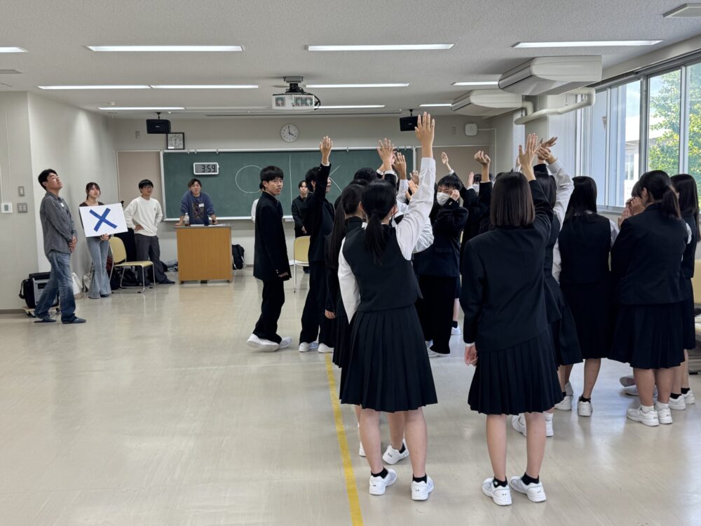 イラスト伝言ゲームでは、当事者の方も交えながら、チームで協力して物語をイラストで伝える楽しさを共有しました。○×クイズでは、障害に関する質問に対して高校生が自分の考えをもとに○か×に移動しながら答え、活発な意見交換が行われました。