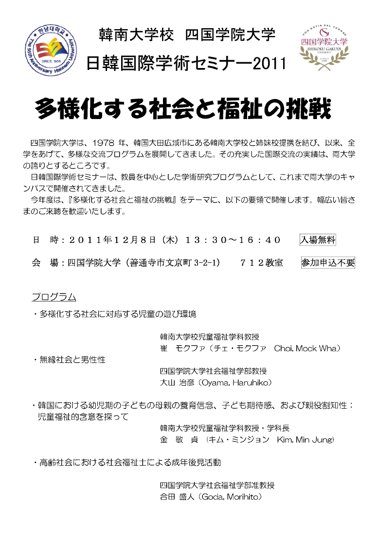 トップ TOPICS 日韓国際学術セミナー2011 「多様化する社会と福祉の挑戦」 開催