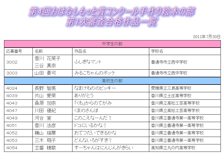 第4回おはなしもっと賞コンクール手作り絵本部門第1次審査合格者発表