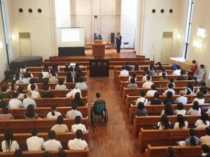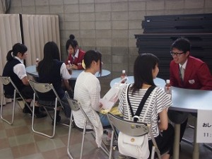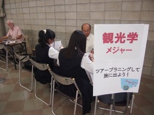 相談ブースでは、高校生や保護者の皆様が興味があるメジャーやマイナーのことを聞いたり、学生生活や奨学金の説明を熱心に質問していました。在学生とのおしゃべりコーナーでは、在学生から授業内容やキャンパスライフなどについて聞き大学生活のイメージを膨らませている様子でした。今回のモデル授業は、平和学メジャーでは「基本的人権の成立」、社会福祉学メジャーでは「貧困問題と社会福祉」、観光学メジャーでは「イベント・文化ツーリズムを楽しんでみよう!」を実施しました。保護者対象説明会には多数の保護者の方にご参加いただきました。