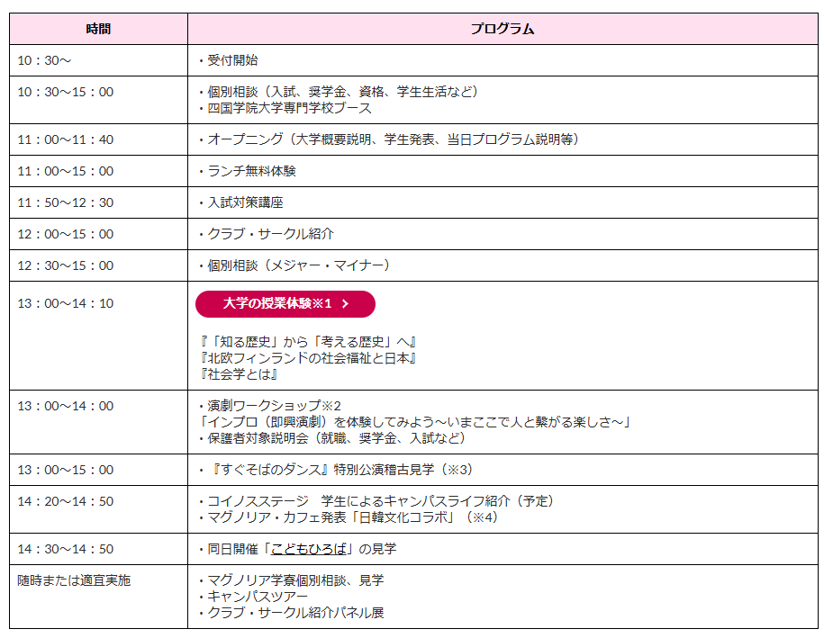 大学概要説明や個別相談、大学の授業体験をはじめ、演劇ワークショップやマグノリア学寮見学、カフェテリア コイノスでのランチ体験もできます。