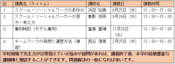 本講座は、生徒や家族、さらには支援チームの一員として先生方の力となるべく、SSWerの活用方法等について分かり易くかつ具体的に講義を行います。