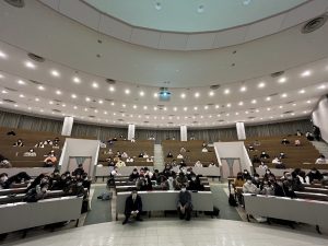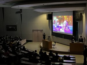 約200名の学生が受講し、講師の話に熱心に耳を傾けていました。