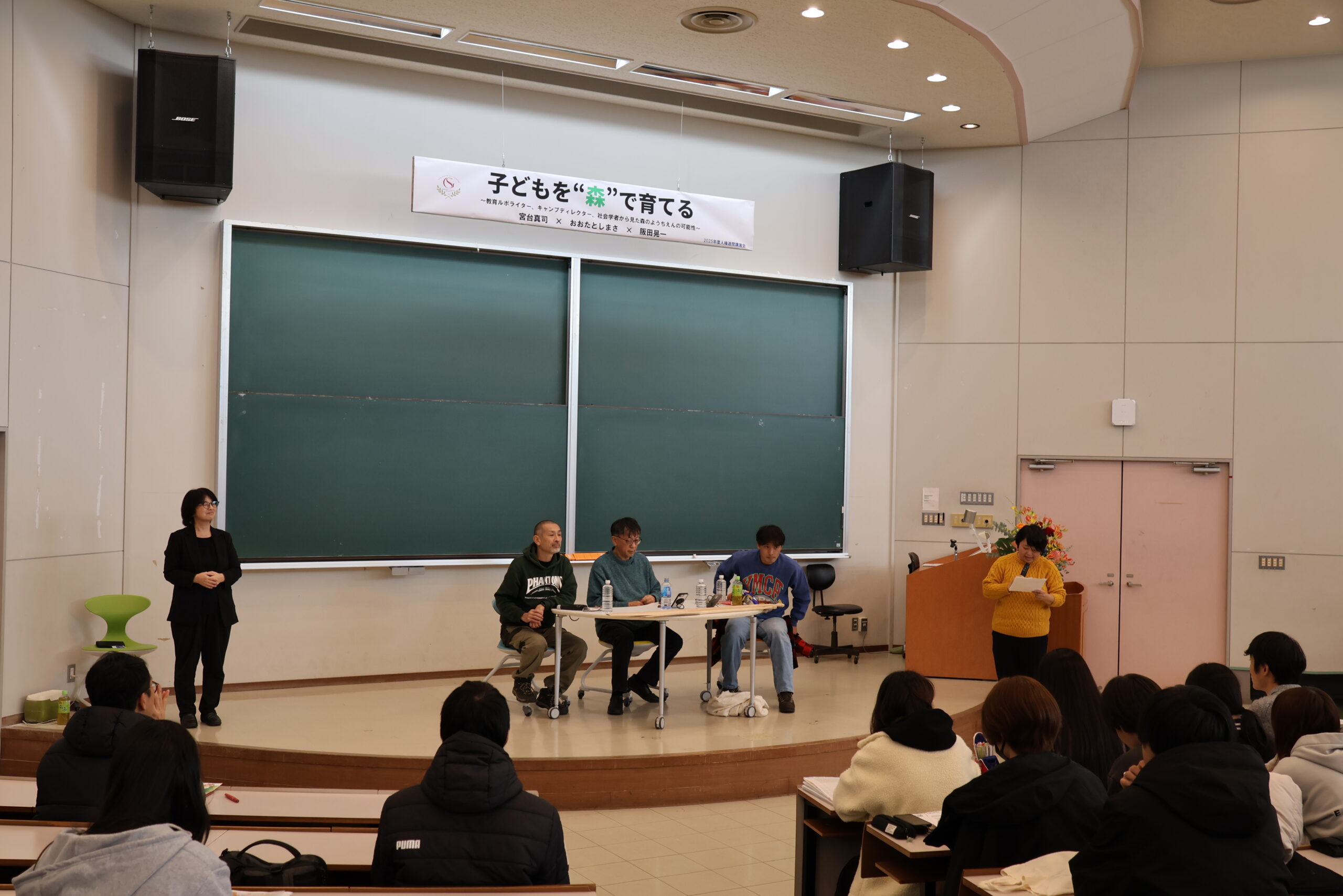 2025年12月18日(木)に開催した人権週間講演会では、社会学者・宮台真司さん、教育ジャーナリスト・おおたとしまささん、キャンプディレクター・阪田晃一さんが、「子どもを“森”で育てる――森のようちえんの可能性」をめぐって語り合いました。学生・教職員・一般の方々など、合わせて約300名が聴講しました。