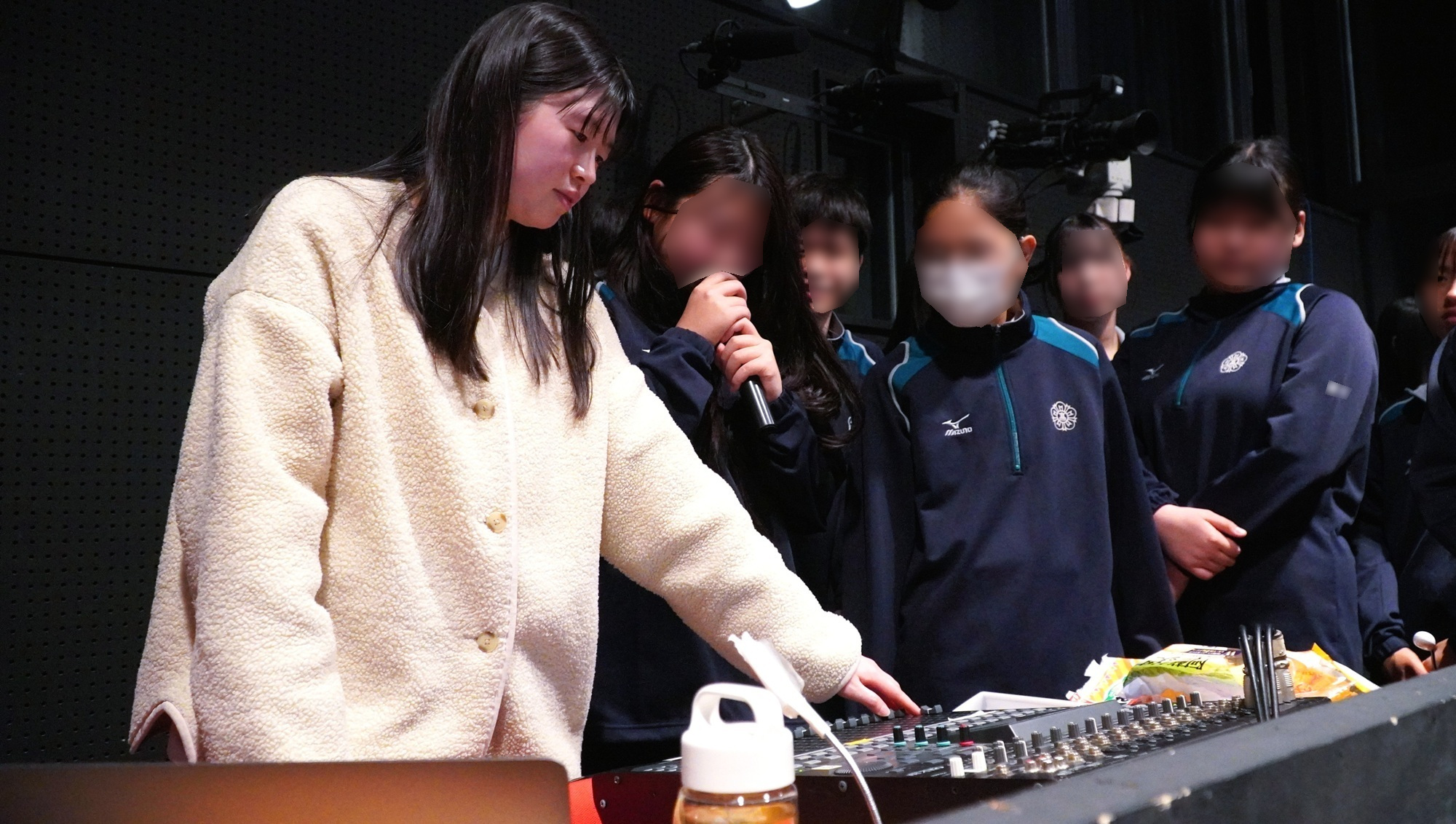 本学学生から説明を受けながら、実際に音響・照明機材を使った上演体験を行いました。